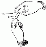 Для упражнения в комнатах приходится довольствоваться бумажным бумерангом, который можно вырезать хотя бы из почтовой карточки в форме, указанной на рис. 36. Размеры каждой ветви — около 5 см в длину и немного меньше 1 см в ширину. Зажмите такой бумажный бумеранг под ногтем большого пальца и щелкните по его кончику так, чтобы удар направлен был вперед и немного вверх. Бумеранг полетит метров на пять, плавно опишет кривую, иногда довольно затейливую, и если не заденет какого-нибудь предмета в комнате, то упадет у ваших ног.