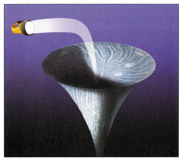 Картина, которую мы теперь можем построить на основе работ Оппенгеймера, выглядит следующим образом. Гравитационное поле звезды изменяет траектории лучей света в пространстве-времени относительно траекторий в отсутствие звезды. Световые конусы, соответствующие траекториям вспышек света, испущенного из их вершин, в пространстве и времени слегка отклоняются внутрь около поверхности звезды. Это можно наблюдать по искривлению траектории света от далеких звезд во время солнечного затмения. По мере сжатия звезды гравитационное поле на ее поверхности усиливается и световые конусы еще больше отклоняются внутрь. Свету становится все труднее ускользнуть от звезды, и удаленному наблюдателю он кажется все слабее и краснее.