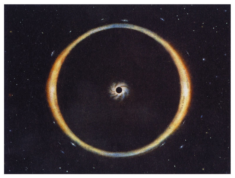Художественное изображение Кольца Эйнштейна, наблюдаемого, когда два массивных объекта находятся на одном луче зрения. Здесь черная дыра (в центре) находится между Землей и некоторой галактикой. Свет, идущий от далекой галактики, отклоняется при прохождении вблизи черной дыры под действием сильнейшего гравитационного поля последней, образуя световое кольцо. Это явление называют гравитационным линзированием. Идея искривления траектории света под действием гравитации была высказана Альбертом Эйнштейном в общей теории относительности (1915 г.). За последние несколько лет было открыто множество гравитационных линз.