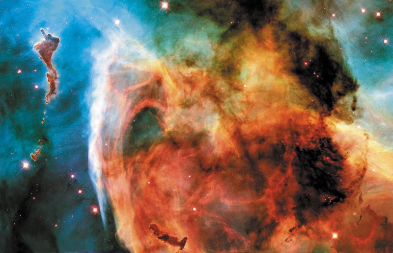 На этой комбинации из 1999 снимков загадочной сложной структуры в туманности Киля, полученных на телескопе «Хаббл», можно разглядеть множество темных глобул малых размеров, которые могут находиться в процессе гравитационного сжатия, ведущего к образованию новых звезд. Два газопылевых облака впечатляющих размеров с резко очерченными краями расположены внизу в центре и около левой верхней границы изображения. Возможно, со временем эти большие темные облака испарятся или, если в них имеются достаточно плотные сгущения, породят небольшие звездные скопления. Туманность Киля диаметром более 200 световых лет является одним из интереснейших объектов Млечного Пути в небе Южного полушария.
