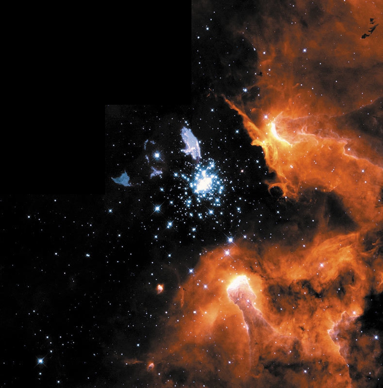 На этом изображении, полученном в естественных цветах, космический телескоп «Хаббл» (NASA) зафиксировал разные стадии жизненного цикла звезд. Выше и левее центра расположен проэволюционировавший голубой сверхгигант SHER 25. Около центра изображения находится так называемое молодое звездное скопление, где доминируют молодые, горячие звезды Вольфа-Райе и ранние звезды О-класса. Мощный поток ионизирующего излучения и быстрые звездные ветры от этих массивных звезд создали большое пустое пространство вокруг этой группы. Темные облака в правом верхнем углу — это так называемые глобулы Бока, которые, вероятно, находятся на более ранней стадии звездообразования.