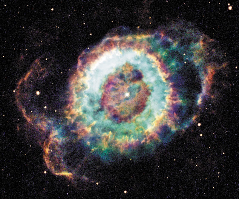 Планетарная туманность NGC 6369 известна аст рономам-любителям под названием «Маленький призрак», поскольку она выглядит как небольшое, похожее на привидение облако, окружающее слабую, умирающую центральную звезду. Когда звезда с массой порядка массы Солнца приближается к концу своего существования, ее размер увеличивается и она превращается в красный гигант. Стадия красного гиганта заканчивается, когда звезда сбрасывает свои внешние оболочки в космос и вокруг нее образуется слабо светящаяся туманность. Ядро звезды, оставшееся в центре, посылает поток ультрафиолетового излучения (УФ) в окружающий газ. Далеко за пределами основного тела туманности можно разглядеть еще более тусклые клочки газа, потерянные звездой в начале процесса сброса внешних оболочек. На месте нашего Солнца тоже может когда-нибудь образоваться подобная туманность, но в течение ближайших 5 млрд лет этого не произойдет. Облако газа будет расширяться, удаляясь от звезды со скоростью несколько десятков километров в секунду, и через несколько десятков тысяч лет растворится в межзвездном пространстве. После этого «тлеющий уголек» звезды, расположенный в центре, будет постепенно остывать в течение миллиардов лет в виде крошечного белого карлика и со временем погаснет.
