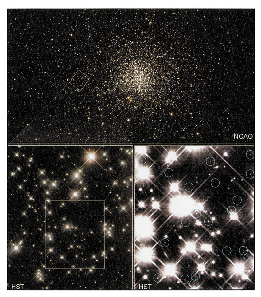 Если масса звезды меньше предела Чандрасекара, в какой-то момент она может перестать сжиматься и перейти в возможную финальную фазу, то есть стать белым карликом. Мы наблюдаем такие белые карлики в нашей Галактике Млечный Путь. Эти небольшие звезды, расположенные в шаровом скоплении M4, имеют возраст порядка 12–13 млрд лет. Добавив 1 млрд лет, ушедших на образование скопления после Большого взрыва, астрономы вычислили, что возраст белых карликов согласуется с предыдущими оценками возраста Вселенной — от 13 до 14 млрд лет. В верхней части представлен панорамный снимок всего скопления, состоящего из нескольких сотен тысяч звезд, заключенных в объеме с поперечными размерами от 10 до 30 световых лет. Снимок сделан с помощью наземного телескопа (1995 г.). В поле слева представлен снимок небольшой области скопления, полученный с помощью телескопа «Хаббл». Пример еще более компактной области представлен внизу справа. На этом небольшом участке «Хаббл» нашел множество тусклых белых карликов. Они отмечены голубыми кружками. Для того чтобы обнаружить эти очень тусклые звезды, потребовалось накапливать сигнал в общей сложности почти восемь дней в течение 67-дневного периода наблюдений.