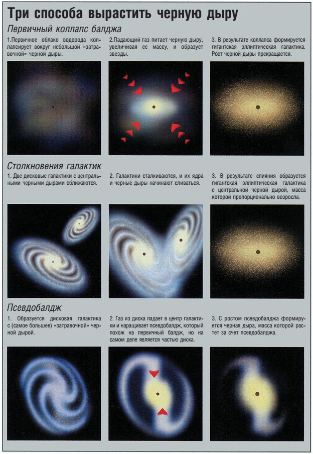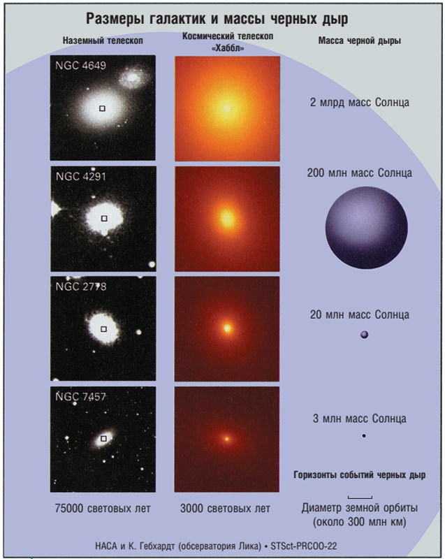 Это сравнение центральных областей четырех эллиптических галактик показывает, что чем массивнее центральный балдж галактики, тем тяжелее ее черная дыра. В левом столбце представлены черно-белые снимки галактик, полученные на наземных телескопах. Квадратиками отмечены центральные области галактик. В центральном столбце приведены увеличенные изображения этих областей, полученные с помощью Широкоугольной планетарной камеры 2 космического телескопа «Хаббл». В правом столбце представлены массы черных дыр и соответствующие диаметры горизонта событий. Массу каждой черной дыры астрономы определяли путем измерения параметров движения звезд вокруг нее. Чем меньше расстояние между звездами и черной дырой, тем выше их скорость. Астрономы открыли поразительную связь между массой черной дыры и средней скоростью движения звезд в центральном балдже галактики. Чем быстрее движутся звезды, тем массивнее черная дыра. Это открытие означает, что гигантские черные дыры не были предшественниками рождения галактик, а эволюционировали вместе с ними, захватывая определенный процент массы звезд и газа центральной области галактики.