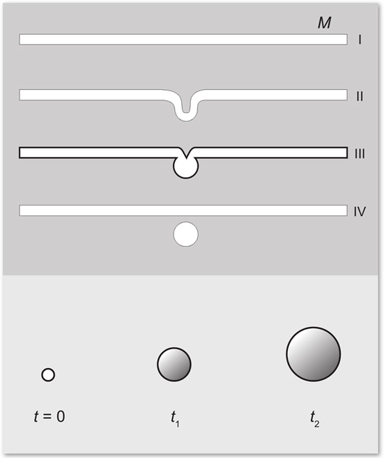Рождение замкнутой Вселенной (шарик на последней части IV рис.) из плоского мира Минковского (М на стадии I). На промежуточных стадиях, вдали от флуктуации, приводящей к рождению (отщеплению) шарика, метрика остается плоской («минковской»). Спонтанное рождение мира «из ничего». До момента t = 0 метрика (и, в частности, время) не существовала.