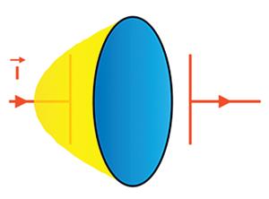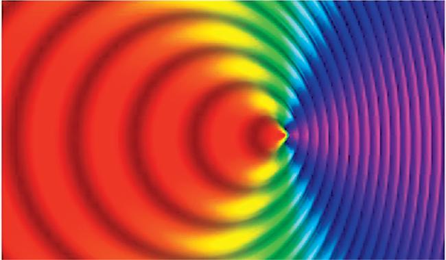 Илл. DD. Если наблюдатель находится в быстром относительном движении, световой пучок будет выглядеть как имеющий различные цвета. Здесь изображен пучок света, излученный источником, который движется направо со скоростью в 7/10 скорости света. Если вы находитесь справа и луч приближается к вам, цвет будет синим, а если вы слева и луч удаляется, то он покажется красным. На изображении представлен «мгновенный снимок» волновой картины, источник находится возле его центра
