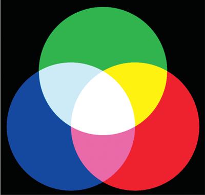 Илл. T. Сочетая лучи красного, зеленого и синего спектра, мы получаем множество воспринимаемых особым образом цветов, включая желтый и белый. Цвет, воспринимаемый в данном случае как белый, значительно отличается от белого солнечного света