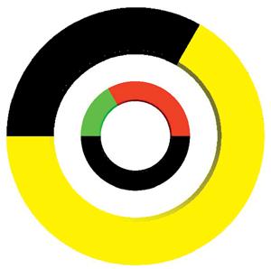 Илл. U. Если наклеить эту фигуру на твердый картонный диск и быстро раскрутить вокруг ее центра, мы получим смесь красного и зеленого цветов из одной полосы и желтый из другой, так что их можно будет легко сравнить. Мы можем регулировать яркость каждой из полос за счет включения черных секторов, которые не отражают никакого света