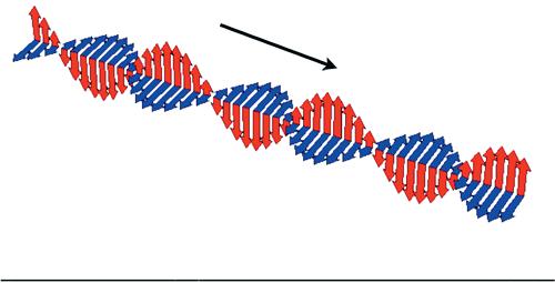 Илл. W. «Моментальный снимок» электромагнитной природы света в соответствии с (правильной) теорией Максвелла. Электрические поля показаны красными стрелками, а магнитные поля – синими. С течением времени этот комплекс возмущений движется вдоль направляющей на юго-восток – со скоростью света!