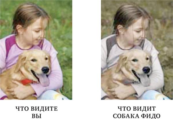 Илл. X. Сделав определенную обработку исходного изображения и спроектировав три цвета на два цветовых измерения, мы можем получить примерное представление о том, чего не видят собаки – и люди, страдающие дальтонизмом
