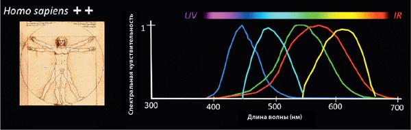 Илл. Y. Система зрения человека основана на трех цветовых рецепторах, а вот у рака-богомола их намного больше. Эти схемы с соответствующими кривыми относительной спектральной чувствительности дают некоторое представление о более мощных цветовых возможностях рака-богомола