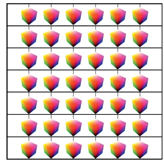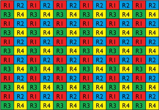 Илл. BB. Периодические матрицы с четырьмя различными типами рецепторов, небольших и близко расположенных друг к другу, могут дать «картинку», тонкая структура которой поддерживает четыре цветовых измерения. Дисплеи, основанные на этой же архитектуре, где по крайней мере один из элементов использует временную модуляцию, способны сделать такую информацию доступной взгляду