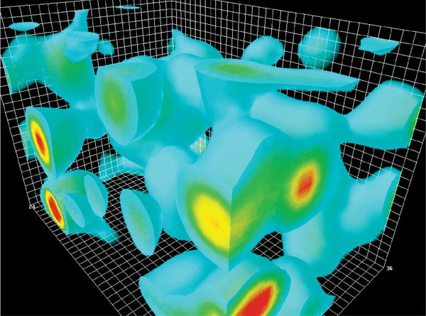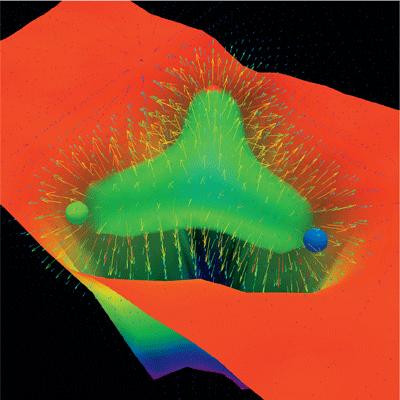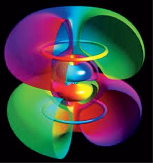 Илл. CC. Физические атомы, описанные математически, являются трехмерными объектами, которые для вдохновленного чувства художника представляются картинами исключительной красоты. Вот перед вами в разрезе электронное облако водорода в возбужденном состоянии. (Для специалистов: в состоянии (n, l, m) = (4, 2, 1).) Поверхности, которые вы видите, – это поверхности равной вероятности, а цветами отображены относительные фазы