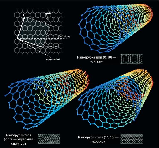 Илл. FF. Сворачивание листа графена различными способами дает много вариантов линейных одномерных молекул – нанотрубок