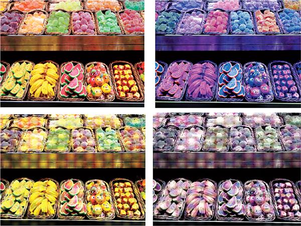 Илл. GG. Иллюстрация трансформаций в цветовом пространстве. Слева вверху мы видим оригинальное изображение прилавка с конфетами в Барселоне. Справа вверху к нему применено простое жесткое преобразование цветового пространства. На двух нижних рисунках применены два различных локальных преобразования: одно слабое и одно достаточно сильное