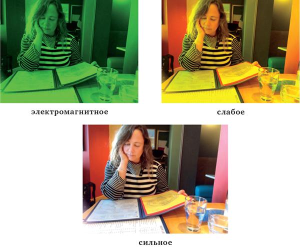 Илл. KK. Здесь концепция цветового пространства свойств иллюстрируется путем ограничения изображения долями цвета, соответствующими линии и лицу, прежде чем мы обращаемся ко всему кубу. Подписи под рисунками (электромагнитное, слабое и сильное) намекают на тот факт, что наши Главные теории электромагнитного, слабого и сильного взаимодействий основаны на пространствах свойств размерностью 1, 2 и 3