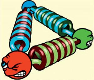 Илл. MM. Кажется, что кваркам нужны какие-то силы, сходные по природе с пружиной или резиновым жгутом, которые усиливаются по мере того, как растягивается соединяющая два кварка связь