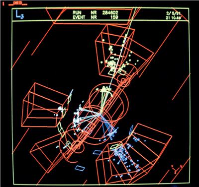 Илл. NN. Электрон и позитрон, ускоренные до высоких энергий и двигавшиеся в противоположных направлениях, аннигилировали, и на картинке представлены последствия этого события. Мы видим три группы частиц, движущихся – очень быстро! – в трех различных направлениях. Эти три струи являются аватарами кварка, антикварка и цветного глюона