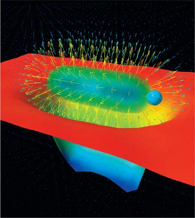 Илл. OO. «Силовые линии», говоря языком Фарадея, которые соединяют кварк и антикварк, образуют плотную трубку. Эта трубка представляет поток цветового электрического поля, который течет от источника-кварка к поглощающему его антикварку. Поскольку глюоны, которые образуют цветовые электрические поля, «клейкие», они связываются вместе. Это явление – ключ к удержанию кварков