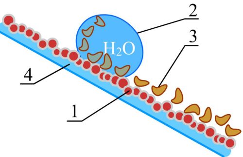 Механизм «самоочищения» стекла автомобиля, обработанного специальными нанополиролями, представлен на рис. 49. Поверхность модифицирована таким образом, что капля воды катится по ней, собирая грязь, тогда как на гладкой поверхности, наоборот, капля воды, сползая, оставляет грязь на месте.