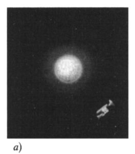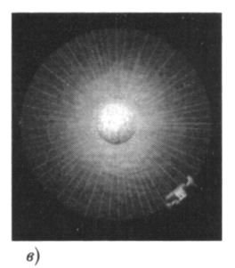 Рис. 13.4. (а) Гравитационное притяжение между двумя объектами, такими как Солнце и спутник, обратно пропорционально квадрату расстоянии между ними. Причина кроется в том, что линии гравитационного поля Солнца расходятся однородно во всех направлениях (б) и, следовательно, их плотность на расстоянии d обратно пропорциональна площади воображаемой сферы радиуса d, схематически изображённой на рис. (в), а эта площадь согласно элементарной геометрии пропорциональна d2