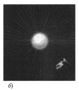 Чтобы это понять, можно, например, думать о количестве гравитонов, испускаемых и поглощаемых объектами в зависимости от расстояния между ними, или о том, насколько кривизна пространства-времени уменьшается по мере увеличения расстояния между объектами. Но мы поступим проще, взяв на вооружение старый подход, который быстро и наглядно приведёт нас к правильному ответу. Посмотрим на рисунок (рис. 13.4а), схематически иллюстрирующий гравитационное поле массивного объекта (например, Солнца), во многом подобный рис. 3.1, на котором представлено магнитное поле стержневого магнита. Отметим важное отличие: в то время как силовые линии магнитного поля простираются от северного полюса магнита к его южному полюсу, линии гравитационного поля однородно расходятся во всех направлениях от одной точки, схематически представляющей Солнце. Сила гравитационного притяжения, испытываемого другим объектом (представим себе спутник, вращающийся по орбите вокруг Солнца), будет ощущаться пропорционально плотности линий поля в месте нахождения этого объекта. Чем больше линий поля пронизывают спутник (как на рис. 13.4б), тем больше испытываемое им гравитационное притяжение.