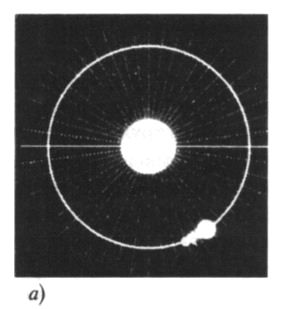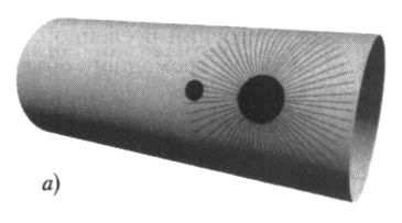 Но если бы Вселенная имела два или даже только одно пространственное измерение, то как изменилась бы формула Ньютона? На рис. 13.5а представлена двумерная версия ситуации с Солнцем и вращающимся спутником. Как видно, линии гравитационного поля Солнца равномерно распределяются по окружности — аналогу сферы в двумерном пространстве. Поскольку длина окружности пропорциональна её радиусу (а не квадрату радиуса), то при удвоении расстояния между Солнцем и спутником плотность линий поля уменьшается в 2 раза (а не в 4 раза), из-за чего сила гравитационного притяжения падает только в 2 раза (а не в 4). Если Вселенная имела бы только два пространственных измерения, то гравитационная сила была бы обратно пропорциональна расстоянию, а не квадрату расстояния.