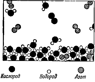 Вы понимаете, конечно, что на самом деле все происходит гораздо сложнее, чем здесь описано. Не только вода переходит в воздух, но молекулы кислорода или азота время от времени переходят в воду и «теряются» в массе молекул воды. Попадание атомов кислорода и азота в воду означает растворение воздуха в воде; если внезапно из сосуда воздух выкачать, то молекулы воздуха начнут из воды выделяться быстрее, чем проникают в нее; мы увидим, как наверх подымаются пузырьки. Вы, наверно, слыхали, что это явление очень вредно для ныряльщиков.
