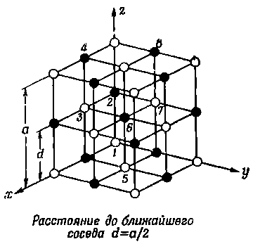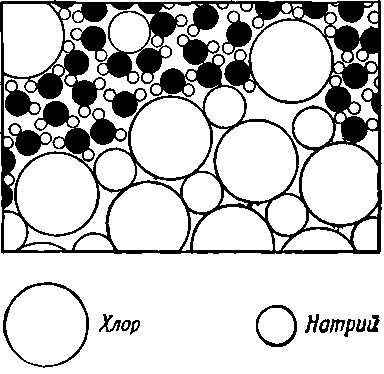 Что получается, если в воду бросить кристаллик соли? Соль — твердое тело, кристалл, в котором «атомы соли» расставлены правильными рядами. На фиг. 1.7 показано трехмерное строение обычной соли (хлористого натрия).