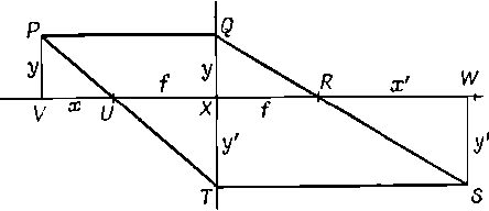 С помощью только этих фактов мы докажем формулу (27.12) геометрическим путем. Пусть объект находится на расстоянии x от фокуса и его высота есть у. Мы знаем, что луч PQ отклоняется и пройдет через фокус R по другую сторону линзы. Если свет от точки Р фокусируется линзой, достаточно определить путь еще одного луча, и тогда фокус будет расположен в точке пересечения двух лучей. Нужно только умело выбрать направление второго луча. Вспомним, что параллельный луч проходит через фокус, и наоборот: луч, проходящий через фокус, выходит параллельно оси! Поэтому проведем луч РТ через U. (Правда, фокусируемые лучи могут быть гораздо тоньше, чем начерченные нами, но их труднее изобразить, поэтому оставим нашу прежнюю схему.) Поскольку луч параллелен оси, проведем TS параллельно XW. Пересечение S и есть искомая точка. Отсюда мы получаем нужную высоту и правильное расстояние. Обозначим высоту через y', а расстояние до фокуса через x'. Теперь можно вывести формулу для линзы. Из подобных треугольников PVU и TXU находим