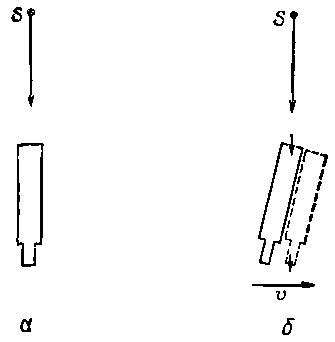 Фиг, 34.12. Удаленный источник света S. а — наблюдаемый через неподвижный телескоп; б — наблюдаемый через телескоп, движущийся в боковом направлении.