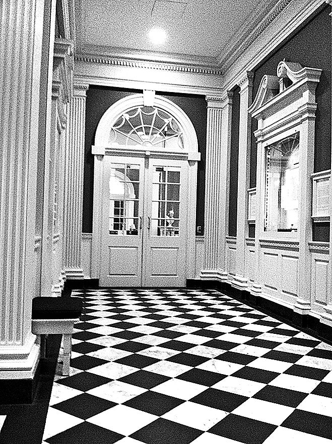 Мы вошли внутрь, в небольшое, но впечатляющее фойе с высоким потолком и ярким черно-белым клетчатым мраморным полом. На стенах, обрамленные в богатое литье, под стеклом висели рукописная копия одной из последних версий Декларации независимости и карта экспедиции Льюиса и Кларка, вычерченная Кларком собственноручно.