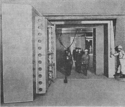 Двери делаются равнопрочными с защитными сооружениями. Но если на остовы заглубленных сооружений действует волна сжатия в грунте, то двери воспринимают воздушную ударную волну. Для защиты от больших давлений они получаются весьма массивными. На рис. 3 показана защитная дверь одного из зарубежных пунктов управления, рассчитанная на избыточное давление в несколько десятков килограммов на квадратный сантиметр.