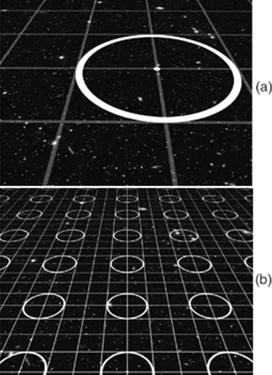 Воспользовавшись двумерной аналогией, мы можем сравнить пространство в некий момент времени с гигантским лоскутным одеялом (с круглыми лоскутками), каждый лоскут которого представляет отдельный космический горизонт. Некто, расположенный в центре лоскута, мог провзаимодействовать со всем, что находится внутри этого лоскутка, но с соседними лоскутками не было никакого контакта, потому что они находятся слишком далеко (см. рис. 2.1а). Точки вблизи границы двух лоскутков расположены ближе друг к другу, нежели соответствующие центры, и поэтому могли бы провзаимодействовать. Но если рассмотреть, например, лоскутки, расположенные через строку и через столбец в космическом одеяле, то ясно, что все точки, расположенные в разных лоскутках настолько далеки друг от друга, что никакое перекрёстное взаимодействие не имеет места (см. рис. 2.1б). Та же самая идея работает и в трёх измерениях, когда космические горизонты — лоскутки на космическом одеяле — имеют сферическую форму. Причём справедлив тот же вывод: достаточно отдалённые лоскутки находятся за пределами сферы влияния каждого и, поэтому, это независимые миры.