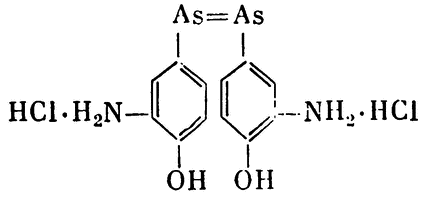 Не только в стоматологии пользуются мышьяком и его соединениями. Всемирную известность приобрел сальварсан, 606-й препарат Пауля Эрлиха — немецкого врача, открывшего в начале XX в. первое эффективное средство борьбы с люэсом. Это действительно был 606-й из испытанных Эрлихом мышьяковистых препаратов. Первоначально этому желтому аморфному порошку приписывали формулу
