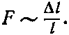 Удлинение бруска ?l зависит и от его длины. Это можно продемонстрировать следующими рассуждениями. Если мы скрепим вместе два одинаковых бруска конец к концу, то на каждый будет действовать одна и та же сила и каждый из них удлинится на ?l. Таким образом, удлинение бруска длиной 2l будет в два раза больше удлинения бруска того же поперечного сечения, но длиной l. Чтобы получить величину, полнее характеризующую сам материал и менее зависящую от формы образца, будем оперировать отношением ?l/l (удлинение к первоначальной длине). Это отношение пропорционально силе, но не зависит от l: