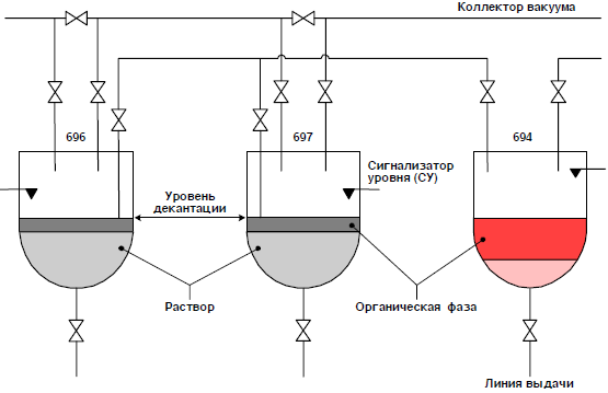 Находившийся сверху слой экстрагента не обнаруживался уровнемером, который срабатывал, когда к датчику поднимался раствор. Поступавшие в ловушки № 696 и № 697 растворы первоначально проходили через слой экстрагента, при этом часть урана переходила в экстрагент. Аналогичная ситуация имела место и в ловушке № 694, в которой передаваемый из ловушек № 696 и № 697 раствор урана смешивался с экстрагентом (верхняя фаза) и затем с раствором (нижняя фаза). Таким образом, происходило постоянное поступление во все три ловушки экстрагента и его насыщение ураном без контроля ситуации.