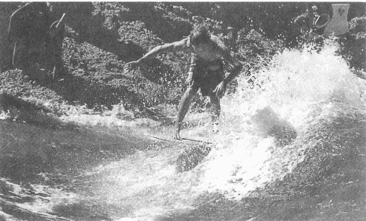 Первые же ручейки расширили русло канала, вымывая песок со стенок. Вскоре ручейки сменились мощным потоком. Сбегая по пляжу и смешиваясь с соленой водой прибойной зоны, вода в определенных местах русла — там, где рельеф дна был соответствующий, — образовывала стоячие волны. Именно они-то и представляли для начинающих серфингистов интерес.