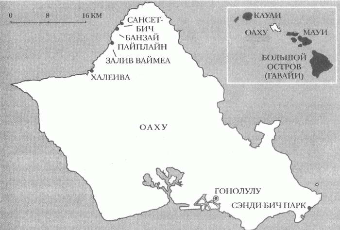«Чаще всего гавайский серфингист пользуется сразу несколькими досками, у него их бывает с десяток, а то и два, — рассказывал Джефф, поясняя, что каждая доска предназначена для катания на волнах определенного прибоя при определенных погодных условиях. — Северное побережье протяженностью в одиннадцать километров уникально тем, что многочисленные рифы подходят к самому пляжу, причем, у каждого рифового барьера волны разбиваются иначе».
