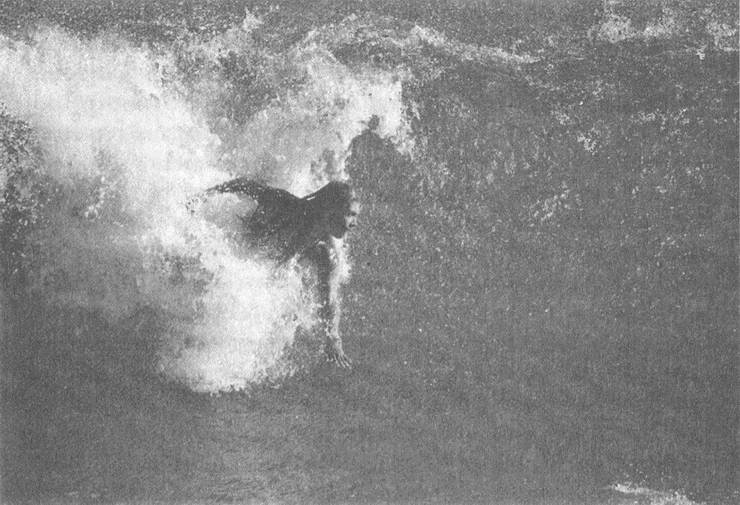 Надо сказать, бодисерфинг не способен собрать армию болельщиков. Помимо его скоротечности, этому не способствует еще и тот факт, что серфингист часто оказывается скрытым водой от глаз стороннего наблюдателя. В бодисерфинге нет тех драматических моментов, которые присутствуют в серфинге на большой волне, когда серфингисты, присев на ярко раскрашенных досках, лихо мчатся вниз по склону громадной волны. Трудно представить, чтобы соревнования по бодисерфингу транслировались по телевидению. Да и с модными причиндалами в бодисерфинге туго. Большинство мужчин носят самые что ни на есть обычные плавки — видимо, по той простой причине, что модные шорты для серфинга только увеличивают сопротивление тела в воде. Кроме того, нет доски — нет места для логотипа фирмы-спонсора. Однако мне такая простота по душе: есть человек, есть волна, и больше ничего не нужно.
