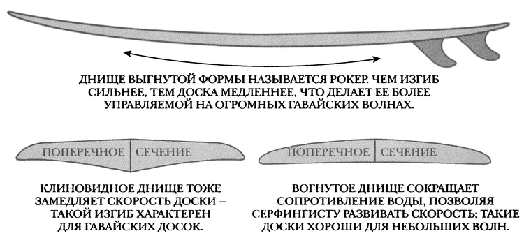 А от других досок гавайские сильно отличаются? «Прибой в этих местах обладает невероятной силой, — напомнил Джефф, — поэтому большинство наших досок сконструированы так, чтобы гасить скорость волны». Для этого днище доски делают слегка выгнутым, что заметно при взгляде на доску сбоку. Другими словами, если поставить доску на ровную поверхность, она слегка качается — от носа к хвосту, как кресло-качалка. Такое выгнутое днище, рокер, замедляет ход доски, а значит, ею легче управлять на очень крутых склонах громадных гавайских волн, совершая поворотные маневры. У досок, предназначенных для больших волн, рокер часто совмещают с легкой клиновидностью книзу (если смотреть на доску со стороны хвоста): к центральной части, где ребро, доска утолщается, по сторонам — тоньше.