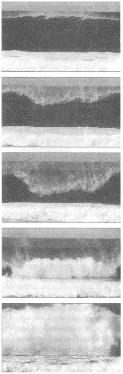 За мгновение до того, как разбиться, волна меняет цвет. Верхняя треть склона из темно-зеленой становится светло-зеленой. В то же время покрывающая склон рябь разглаживается, теряясь в длинных, равномерных бороздах, прорезывающих склон и сопровождаемых изящными бороздками-гирляндами из крошечных пузырьков.