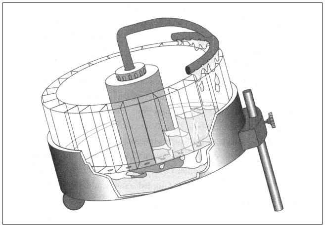 Пластиковое колесо диаметром около одного фута вращается в плоскости, слегка наклоненной по отношению к горизонту (в отличие от обычного водяного колеса, которое вращается в вертикальной плоскости). При нажатии на переключатель вода автоматически подкачивается в подвесной коллектор (перфорированный рукав), а затем выпускается через десятки маленьких отверстий в раздельные камеры, расположенные по периметру колеса (аналог бумажных стаканчиков в первоначальной версии). В нижней части каждой такой камеры вода просачивается через микроканал и собирается в резервуаре, помещенном под колесом, откуда она закачивается обратно через упомянутые выше отверстия. Такая схема рециркуляции обеспечивает устойчивый приток воды.