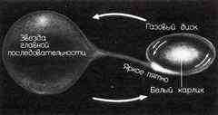 Что же дали наблюдения этого слабого объекта? Самое главное, пожалуй, в том, что при внимательном изучении эта экс-новая оказалась двойной звездой. Это открыл в 1954 г. американец Мерл Уокер из Ликской обсерватории. Звезды этой системы обращаются с периодом 4 часа 39 минут. Благодаря тому, что звезды при обращении затмевают друг друга, о них удалось узнать больше. Одна из звезд — белый карлик с массой, равной солнечной. Вторая, по всей вероятности, обычная звезда главной последовательности с меньшей массой. Но эта система преподнесла и сюрприз. Главная звезда полностью заполняет свою полость Роша, и с ее поверхности вещество переходит на белый карлик. Как и в системе Алголя, мы имеем дело с полуразделенной системой, в которой происходит перенос вещества с одной звезды на другую, но в данном случае вещество попадает на белый карлик.
