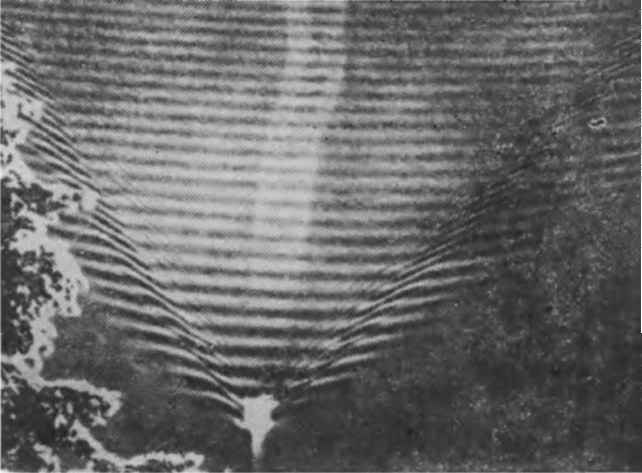 Она велика для очень коротких волн, велика для очень длинных волн, но между ними существует некоторая минимальная скорость распространения. Исходя из этой формулы, можно вычислить и групповую скорость: она оказывается равной 3/2 фазовой скорости для ряби и 1/2 фазовой скорости для волн «тяжести». Слева от минимума групповая скорость больше фазовой, а справа групповая скорость меньше. С этим фактом связано несколько интересных явлений. Поскольку групповая скорость с уменьшением длины волны быстро увеличивается, то, если мы создадим какие-то возмущения, возникнут волны соответствующей длины, которые идут с минимальной скоростью, а впереди них с большей скоростью побегут короткие и очень длинные волны. В любом водоеме можно легко увидеть очень короткие волны, а вот длинные волны наблюдать труднее.