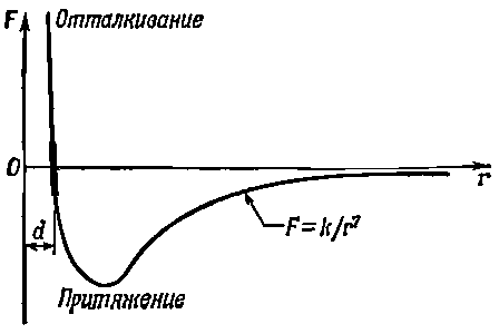 Фиг. 12.2. Сила, действующая между двумя атомами, как функция расстояния между ними.