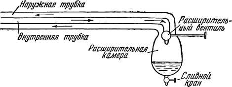 По внутренней трубке сжатый воздух идет к особому крану, называемому расширительным вентилем. Выходя из вентиля в камеру, воздух расширяется. При этом его давление падает до атмосферного, а температура понижается на несколько градусов. Затем охлажденный воздух покидает расширительную камеру. Направляясь к выходу из аппарата по наружной трубке теплообменника, он омывает внутреннюю трубку со следующей порцией сжатого воздуха и отдает ему часть своего холода. К моменту расширения новые порции сжатого воздуха, поступающего по внутренней трубке теплообменника, будут уже более холодными, а в камере их температура станет еще ниже.