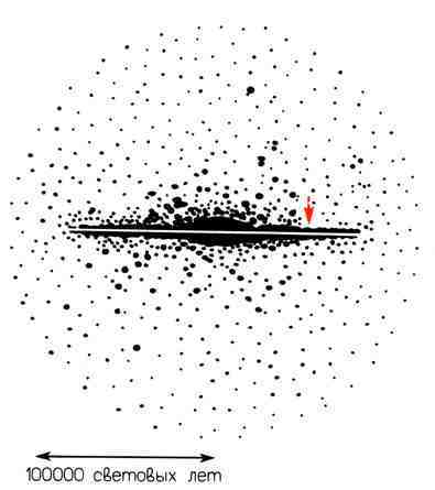 Рис. 12.3. Схема строения Млечного Пути. Большинство звезд находится в плоском диске (на рисунке мы смотрим на него сбоку). Стрелкой указано положение Солнца, светлая полоска посередине изображает поглощающие пылевые массы. Шаровые скопления (жирные точки) и очень старые звезды (мелкие точки) образуют гало Млечного Пути. Эти звезды существуют очень давно. Звезды, рождающиеся сегодня, находятся только в непосредственной близости к пылевым массам в центральной плоскости Галактики.