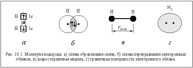 Двухатомная молекула водорода Н2 образуется при связывании атомов водорода единственной возможной для них ковалентной связью. Связь образуется по обменному механизму. По способу перекрывания электронных облаков это s-связь (рис. 10.1 а). Так как атомы одинаковы, связь неполярная.
