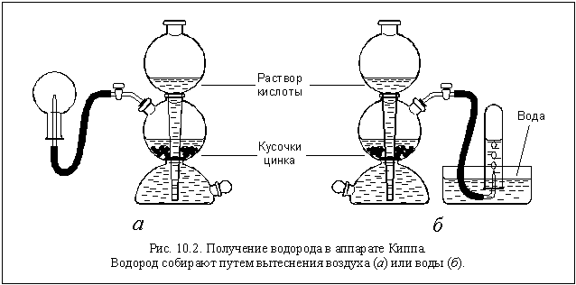 Вместо цинка можно использовать железо, алюминий и некоторые другие металлы, а вместо серной кислоты – некоторые другие разбавленные кислоты. Образующийся водород собирают в пробирку методом вытеснения воды (см. рис. 10.2 б) или просто в перевернутую колбу (рис. 10.2 а).
